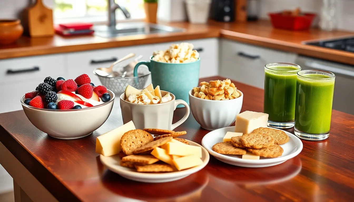 Creating snacks in five minutes is possible with simple ingredients. Combine greek yogurt with honey and top it with mixed berries for a refreshing treat. Slice an apple and pair it with almond butter for a satisfying crunch. Prepare a microwaveable mug of popcorn seasoned with spices for a warm snack. Assemble a simple cheese plate with different cheese varieties and whole-grain crackers. Finally, blend spinach, avocado, and banana for a quick smoothie.